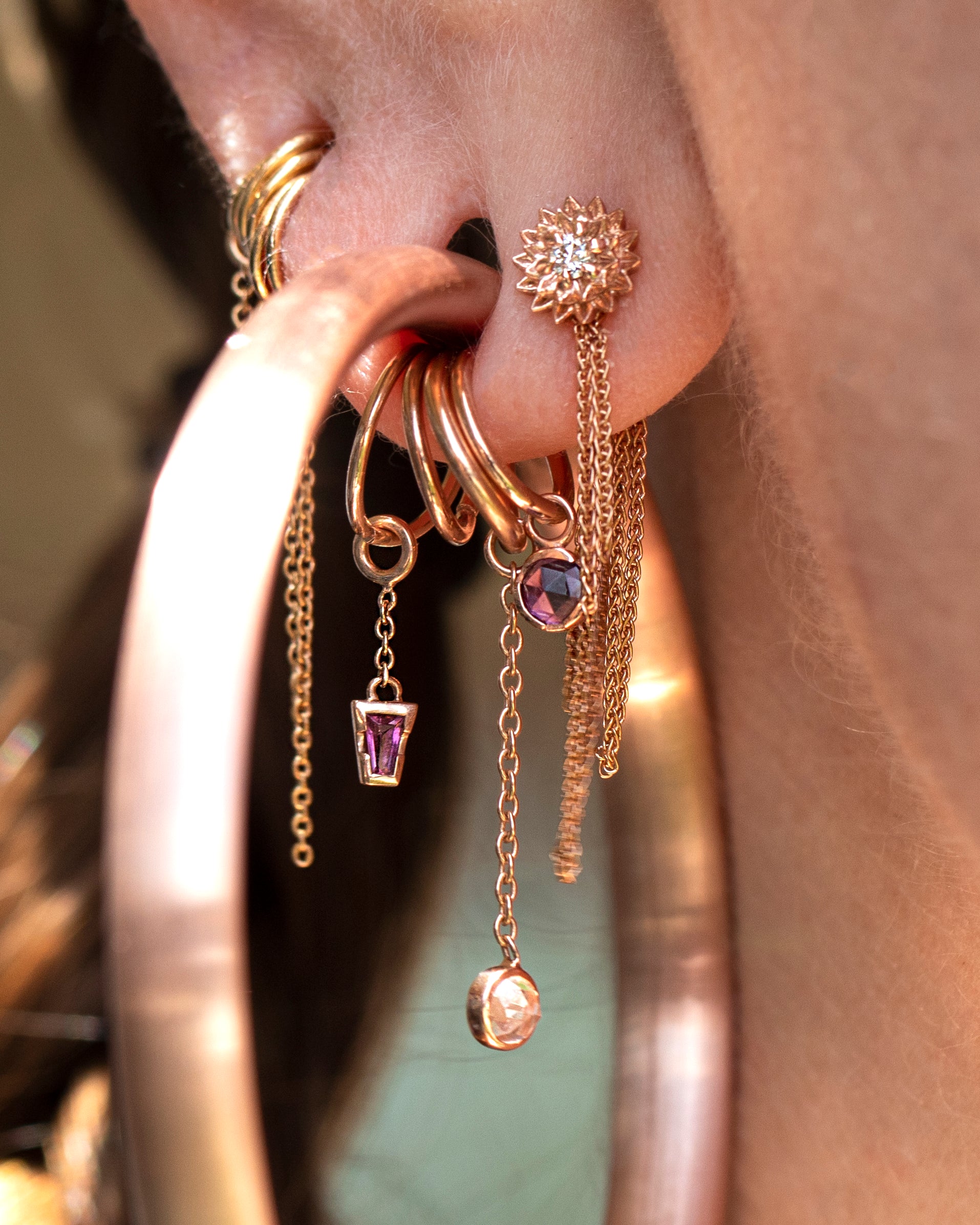 A considered curation goes beyond the threadless end. Working with your piercer, the look is completed through thoughtful accents like charms, chains, pendants, and sculptural hoops bringing depth and movement.